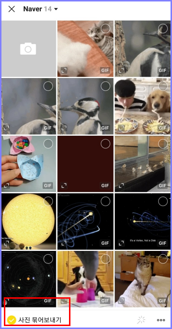 그러면 바로 자신의 핸드폰 갤러리 사진들이 나오는데 하단 아래 '사진 묶어 보내기'를 체크를 해줍니다!