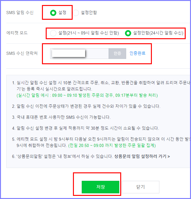 박스가 뜨면 SMS 알림수신을 설정으로 해두고 에티켓 모드도 원하는 시간에 따라 설정 또는 설정안함으로 선택해줍니다!
