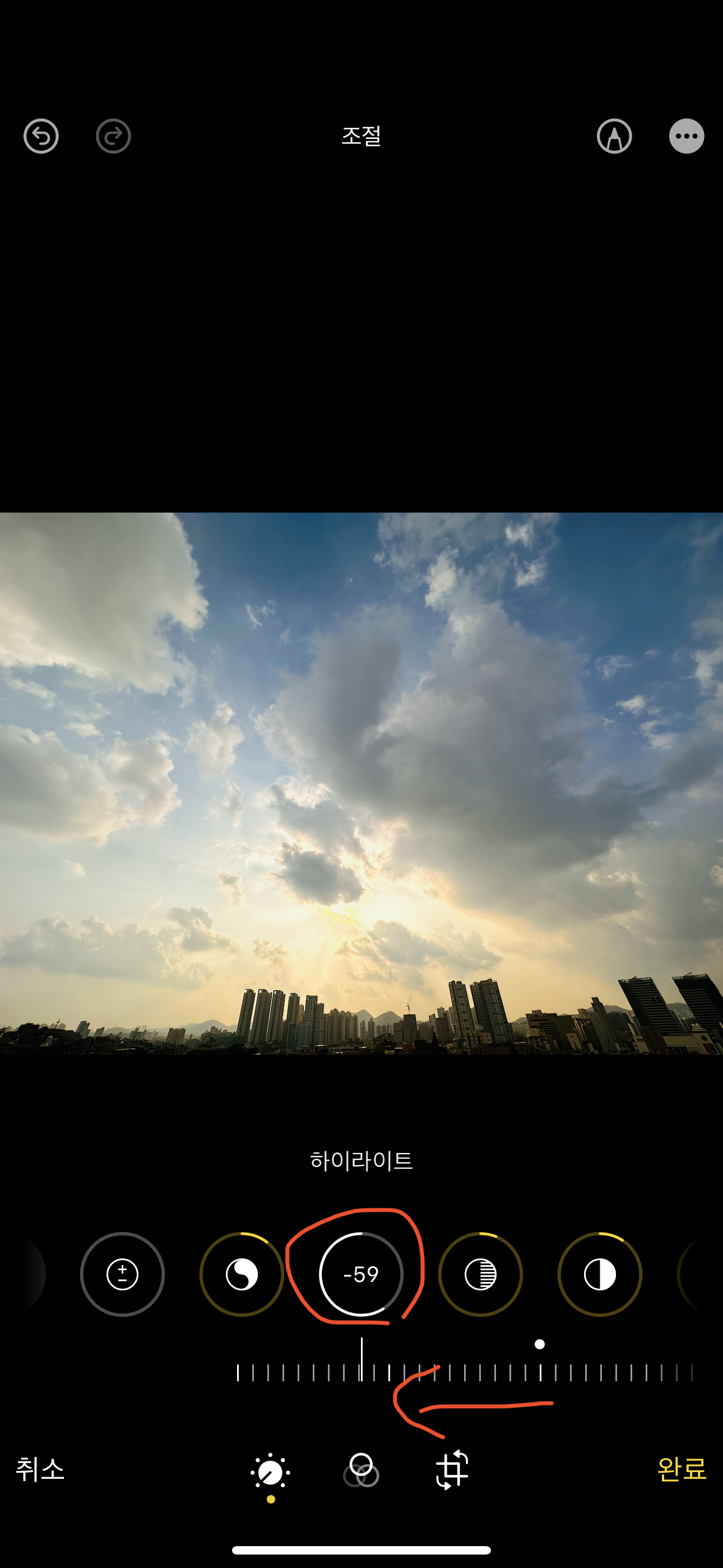 저는 처음에 하이라이트를 골라 왼쪽으로 조절을 해주었어요. 색상이 조금 더 선명하고 어두워진 느낌입니다.