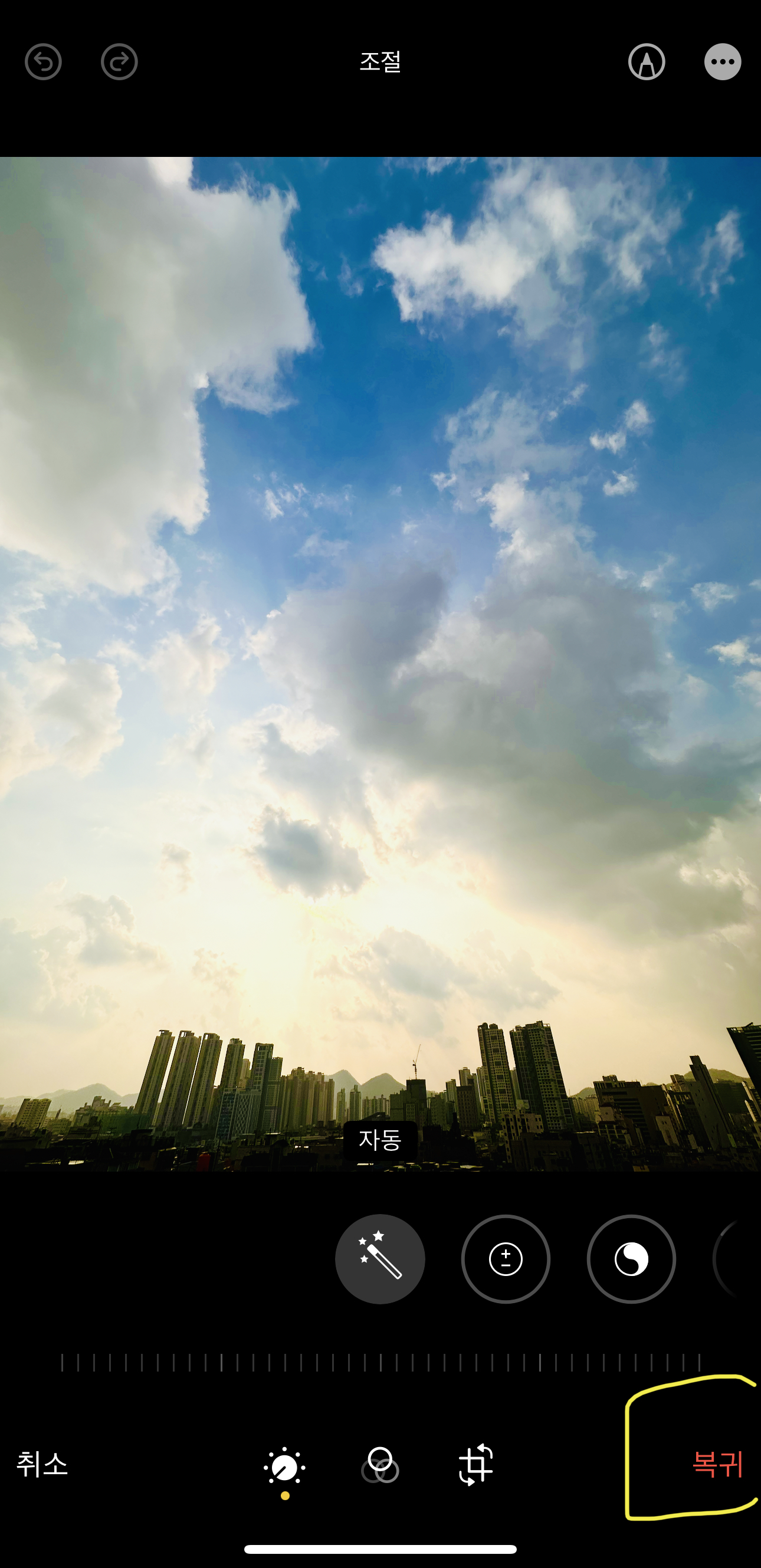 편집으로 색상 보정이나 잘라내기 등 원본사진을 수정했다면 그 사진에서 편집을 눌러보면 이렇게 하단 오른쪽에 복귀라는 글자가 뜨니 언제든 보정 전 사진으로 되돌아갑니다.