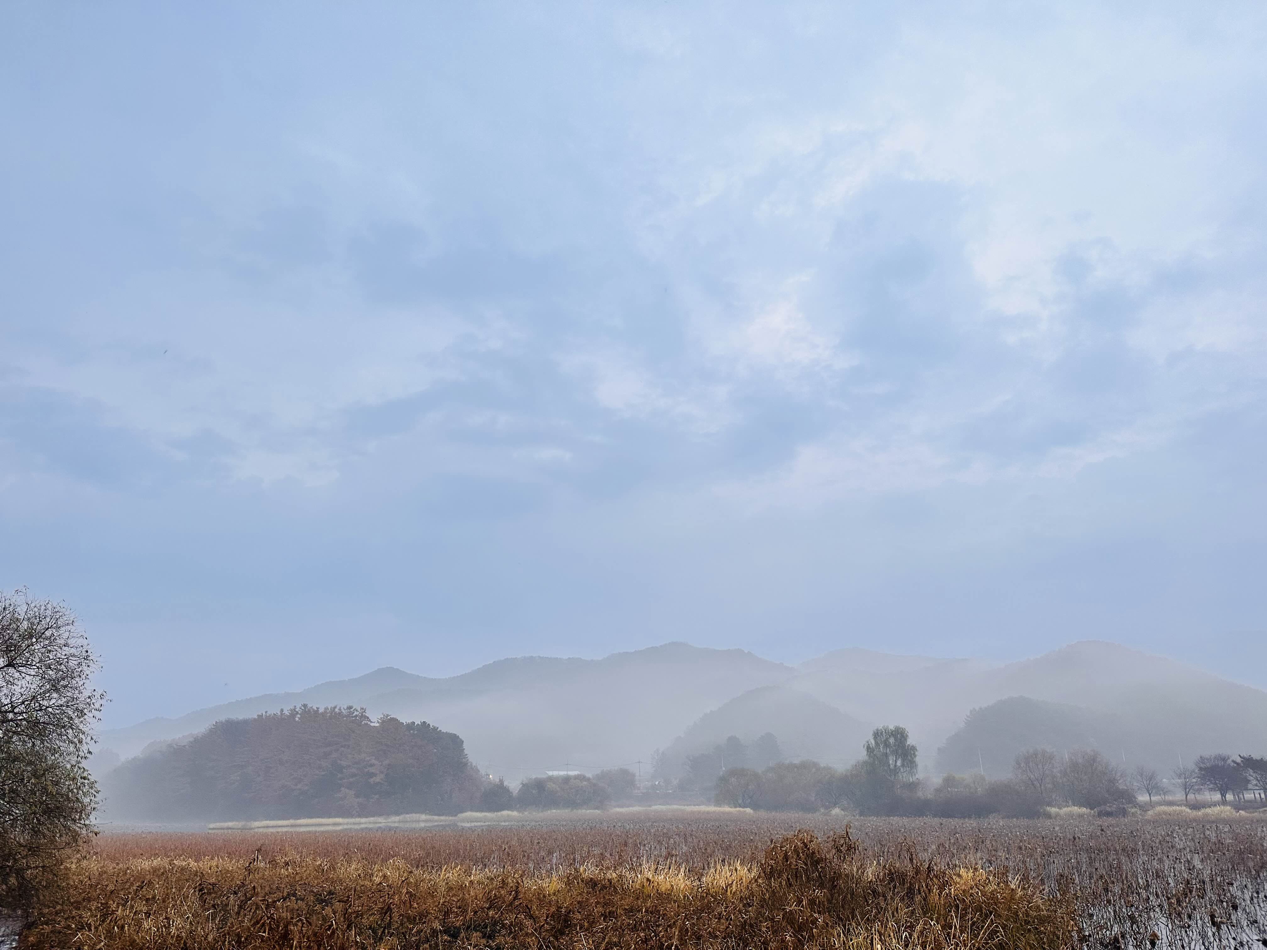 저녁때 비가 와서 산에 온통 안개가 내려와 정말 예쁜 장면이어서 찍은 사진인데 날이 흐리니 실제 눈으로 보는 장면을 카메라가 그대로 담지는 못하더라고요.