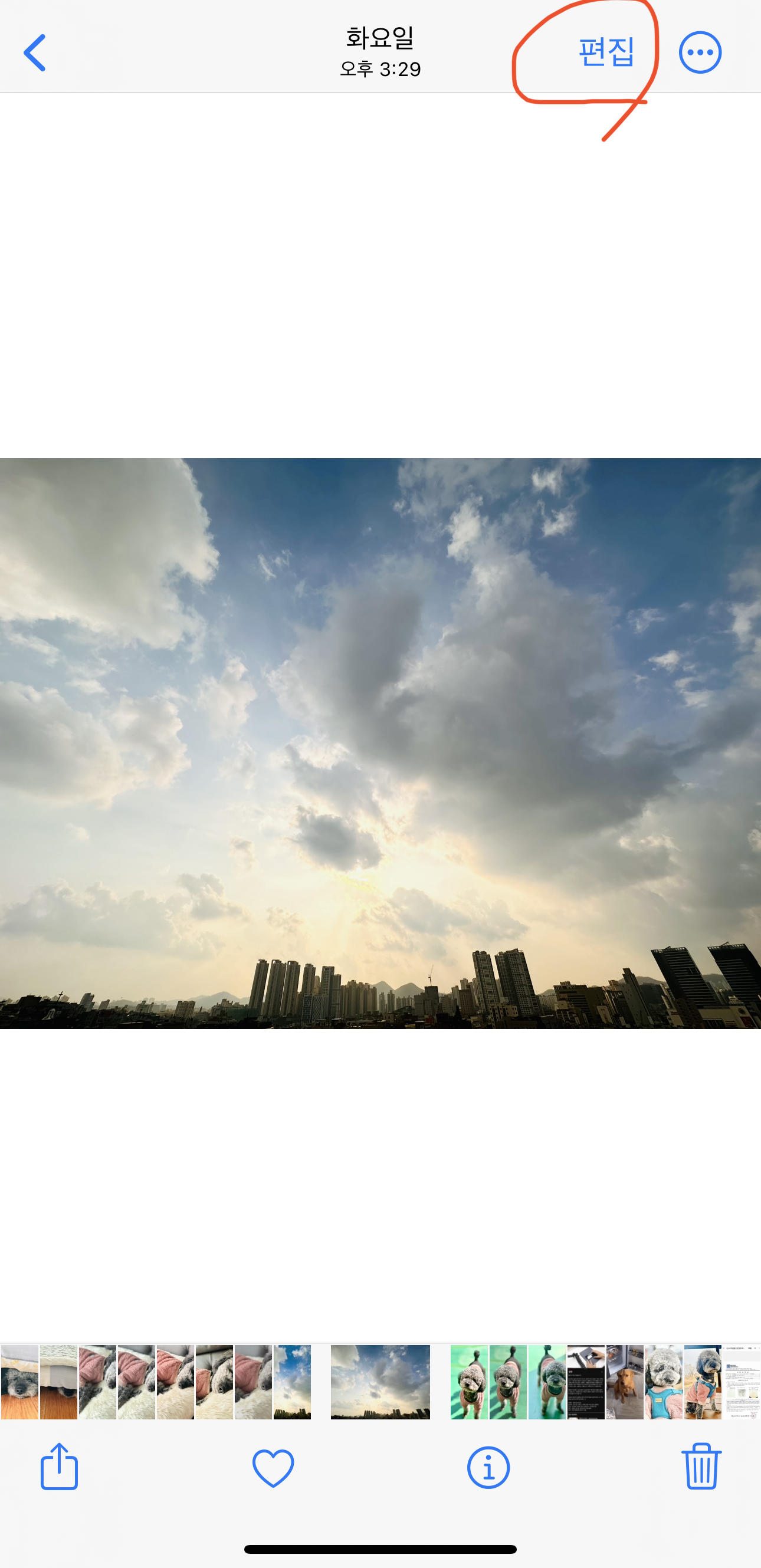 저녁 하늘이라 보정 후 사진이 훨씬 해질녘 느낌이 나는 것 같아요. 물론 아직 아이폰 입문 초보라 보정 후 사진이 보정이 잘된 사진이라 할 수 없는데 sns를 구경하다 보면 정말 기가 막히게 예쁜 색상의 사진들을 올리는 전문가분들도 많으시더라고요.