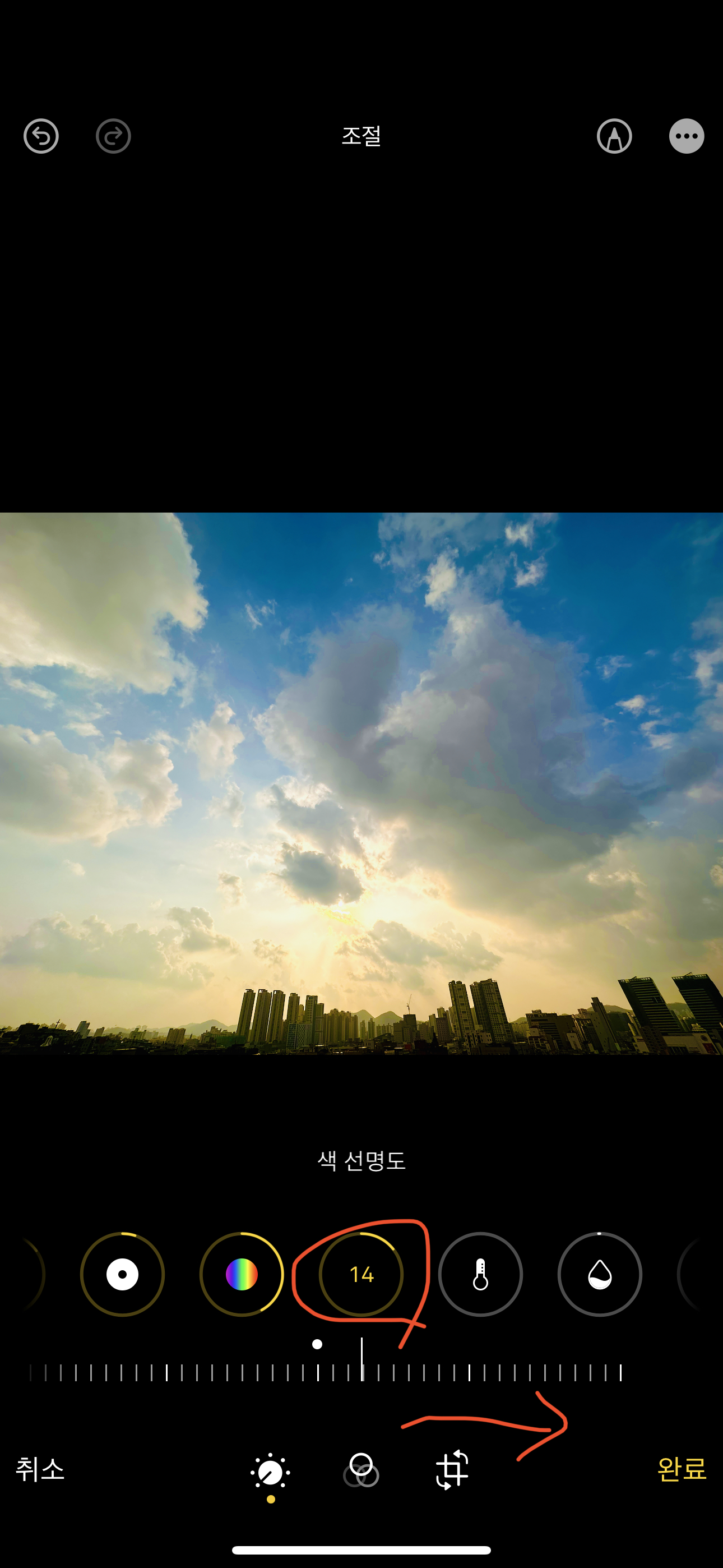 색 선명도도 화살표 방향으로 조절해줬더니 사진이 더 선명해졌어요.