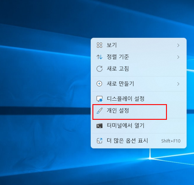 우선 바탕화면에서 오른쪽 마우스를 눌러 개인 설정을 클릭을 해줍니다!