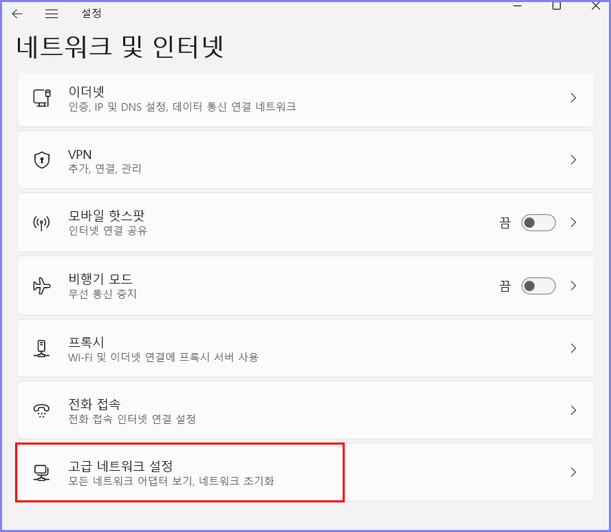 네트워크 및 인터넷 안에 들어가서 밑으로 스크롤을 내리면 고급 네트워크 설정이 보일 거예요! 클릭을 해줍니다!