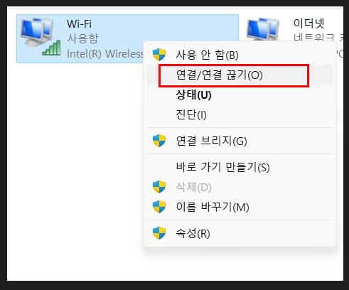 오른쪽 마우스를 눌러 사용함으로 바꿔 주시고 연결/연결 끊기 등 선택할 수 있습니다!