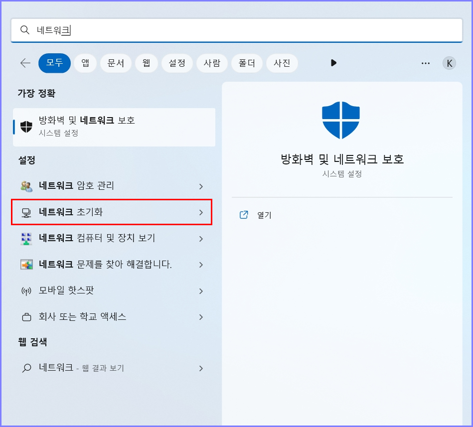 만약 개인적으로 네트워크 초기화를 해서 네트워크 연결을 하실 수 있는 분들이라면 네트워크 초기화 경로도 한번 들어가 볼까요?