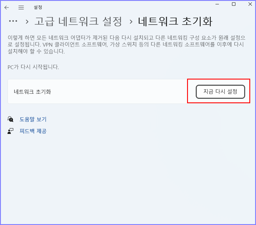 네트워크 초기화에서 지금 다시 설정을 클릭을 해줍니다!