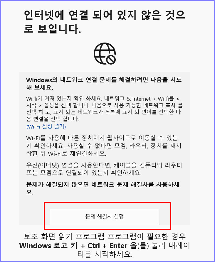 인터넷 연결이 안 될 때 네트워크 및 인터넷 해결 경로를 찾아가는 경로를 나중에라도 기억하고자 블로그에 올려놓습니다.