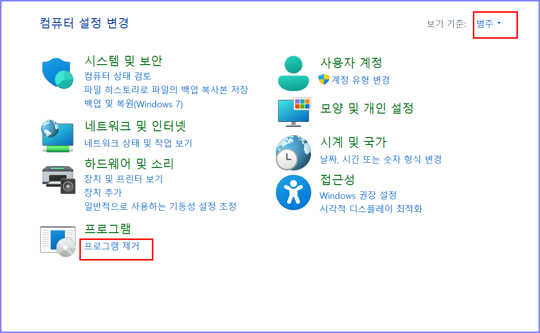 오른쪽 상단이 범주로 되어 있는지 체크하고 프로그램 제거를 클릭을 해줍니다!
