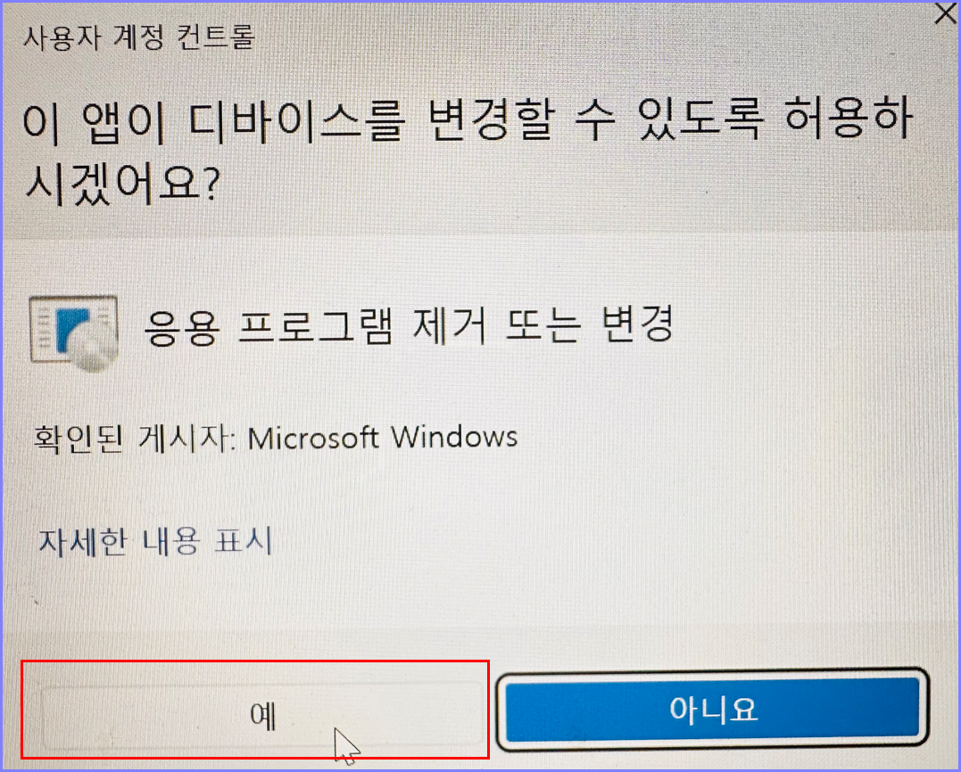 '응용 프로그램 제거 또는 변경' 창이 뜨면 '예'를 눌러줍니다.