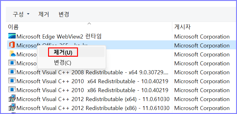 자! 프로그램 제거할 수 있는 창이 떴는데 Microsoft Office 365 프로그램 영어 버전, 한국어 버전이 보이지요?