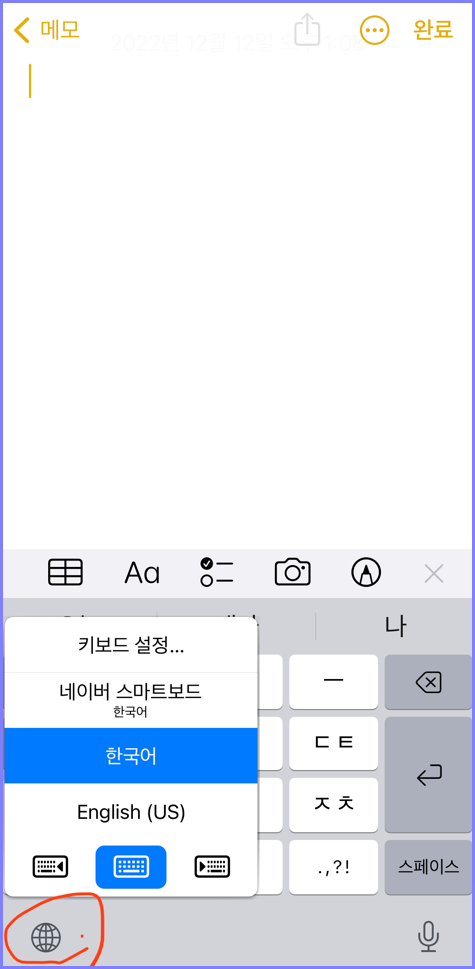 그리고 왼쪽 하단 아래 지구본을 꾹~ 누르면 한글 - 영어 - 그 밖의 외국어 등 다양하게 바꾸고 키보드 자판이 왼쪽, 오른쪽으로 배열되게 바꿀 수 있습니다.