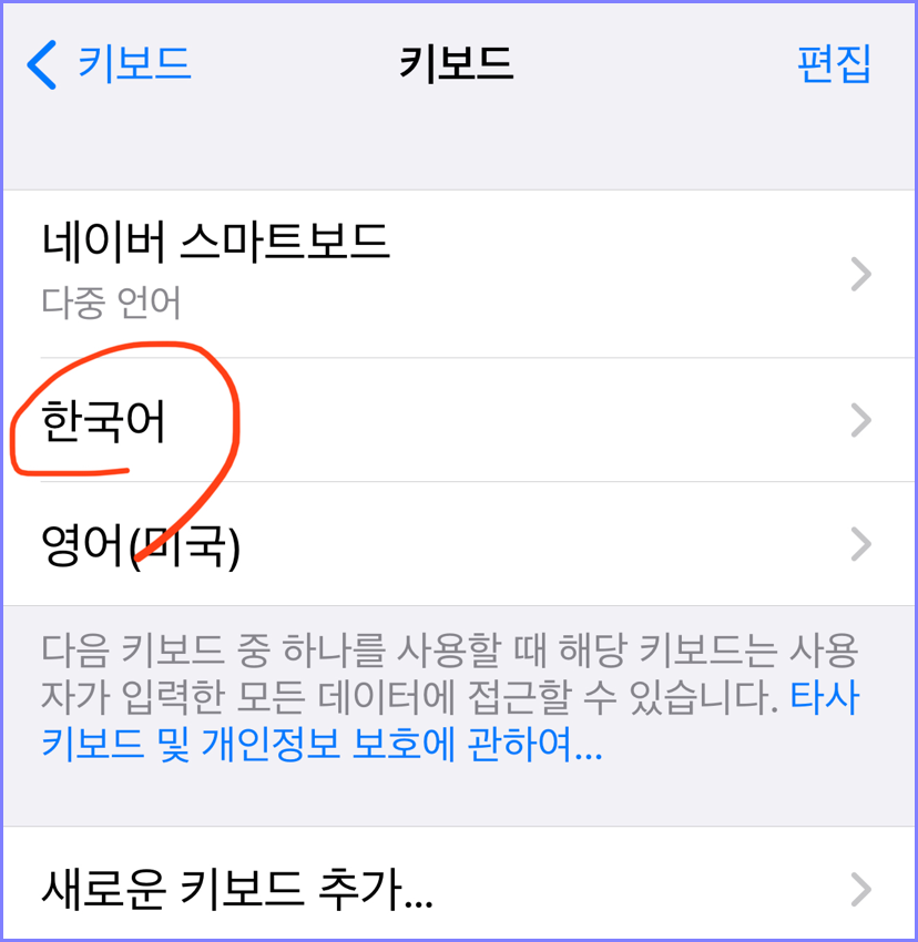 여기에서 다른 언어 키보드를 더 추가하려면 아래 새로운 키보드 추가를 눌러 원하는 원어를 더 추가해주면 됩니다.
