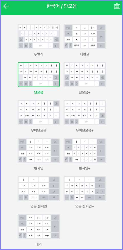 네이버 스마트보드는 '두벌식,나랏글,단모음,단모음+,무이단모음,무이단모음+,천지인,천지인+,넓은 천지인,넓은 천지인+,베가'등 다양한 한국어 키보드를 지원해주고 있습니다.