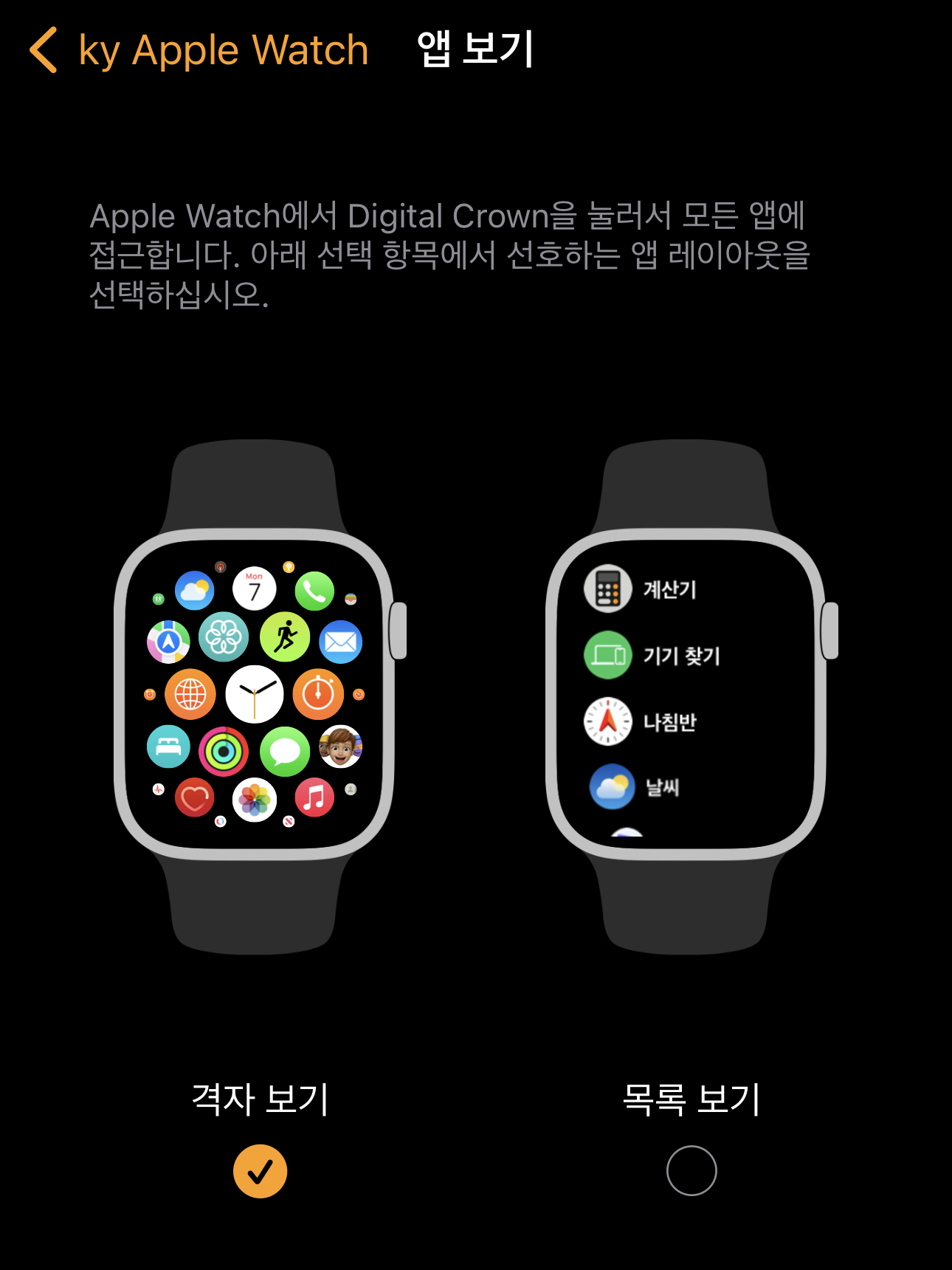 애플워치에서 앱보는 방식을 아이폰 Watch앱에서 '격자 보기 또는 목록 보기'를 선택해서 볼 수 있습니다.