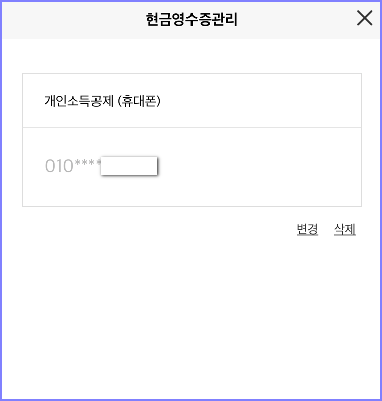 되돌아기를 해서 현금영수증관리에 다시 들어가 보면 개인소득공제(휴대폰)에 본인의 휴대폰번호가 등록이 되어있는 것을 확인할 수 있습니다!