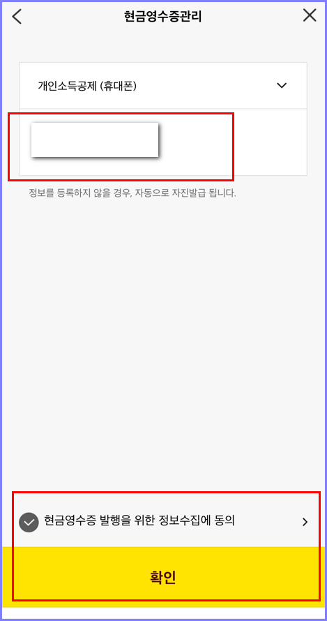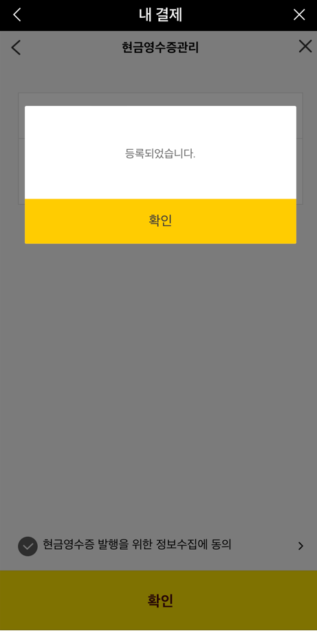 현금영수증 발행을 위한 정보수집에 동의에 체크를 해주고 확인을 눌러줍니다!