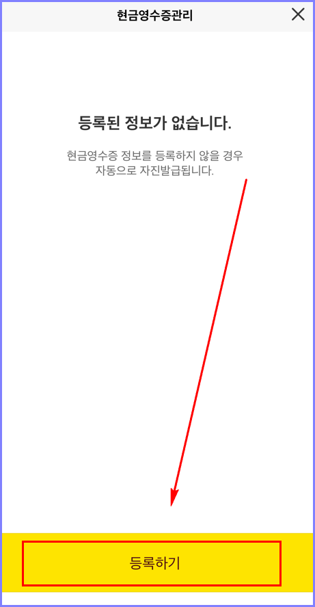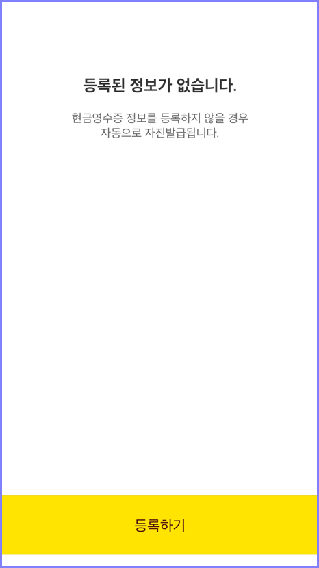 아마 대부분 현금영수증 자동발행 등록을 안 해놓은 분들은 이렇게 등록된 정보가 없다고 뜰 거예요~