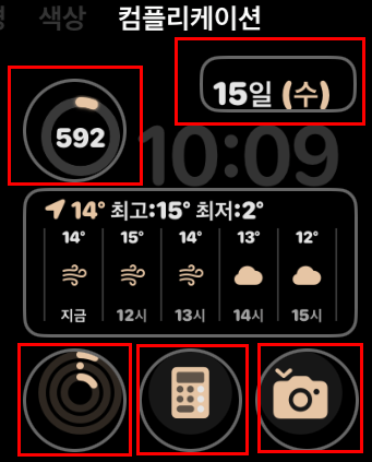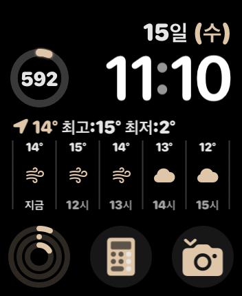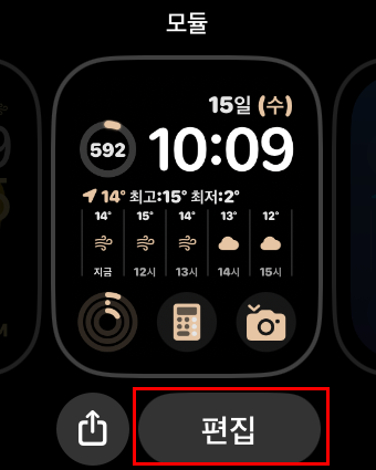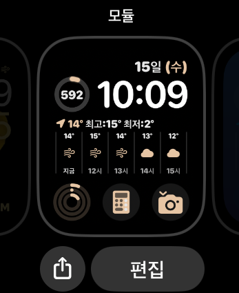 다른 시계페이스에도 편집이 가능합니다! 시계페이스 중 많은 기능을 편집할 수 있는 '모듈'이라는 페이스인데 애플워치 8시리즈 중에서 이 '모듈' 페이스도 편리해서 위의 시계페이스와 동일하게 편집해서 사용하고 있습니다!