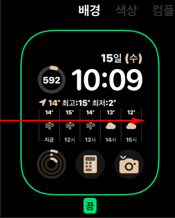 저는 피트니스, 계산기, 카메라 등을 자주 클릭을 하기 때문에 이 기능 들을 삽입을 했고 만보걸음표시는 제일 상단에 넣어 한눈에 보게 했습니다!