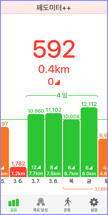 아이폰에서 페도미터 걸음수표시 어플에 들어가보면 그동안 운동했던 기록들을 더 자세히 볼 수 있습니다!