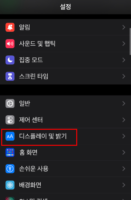 설정에서 디스플레이 및 밝기를 클릭을 해줍니다.