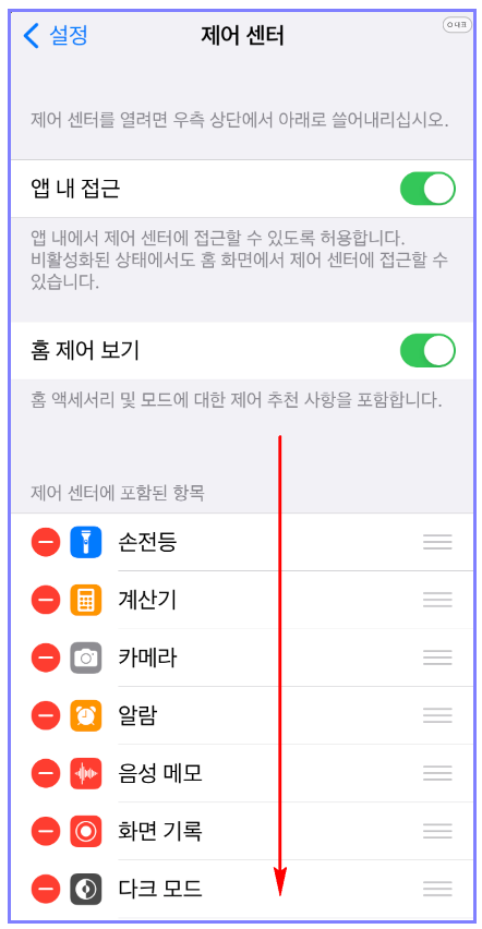 제어센터에서 앱 내 접근과 홈 제어 보기 버튼을 활성화시켜놓고 아래로 죽 스크롤을 해줍니다!