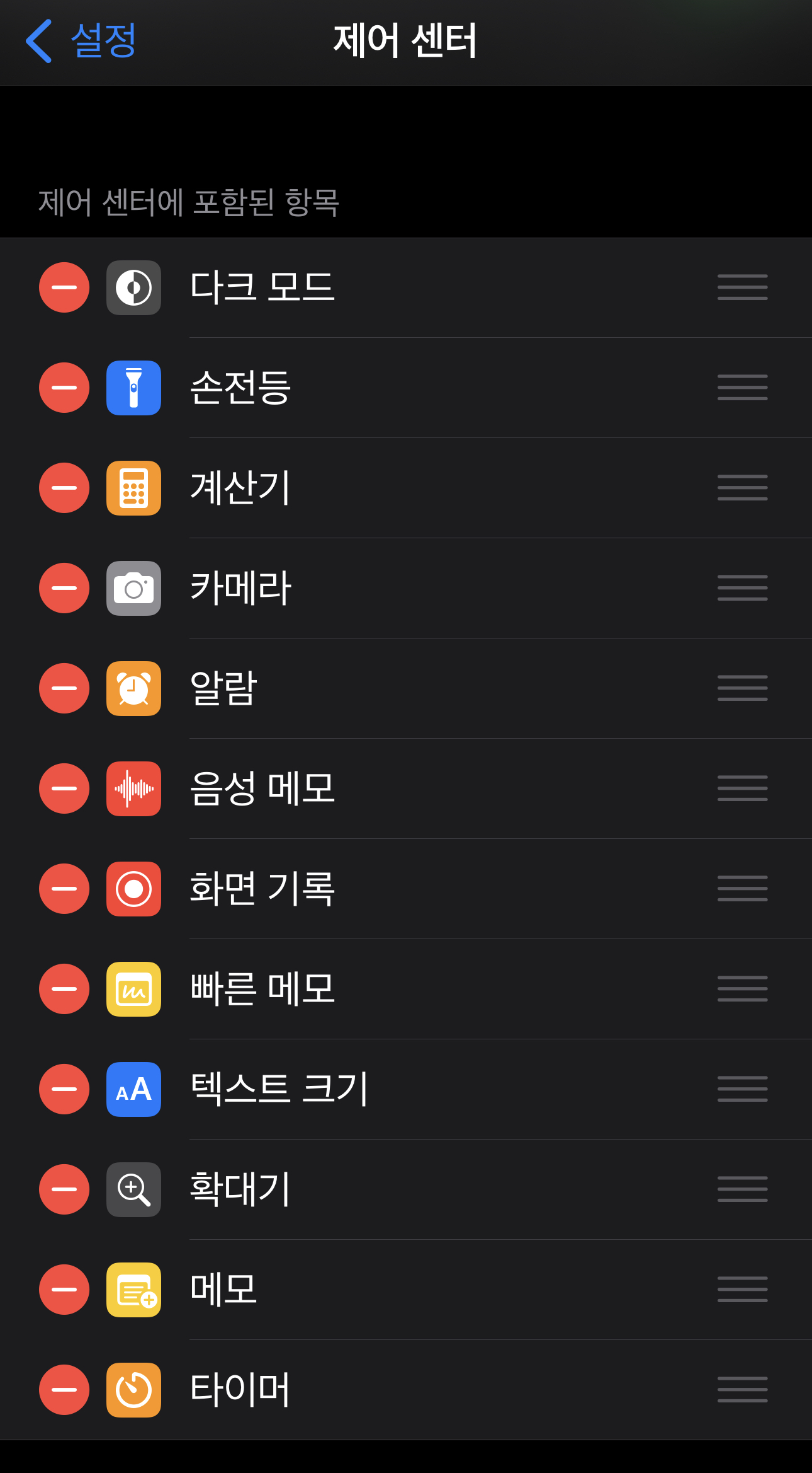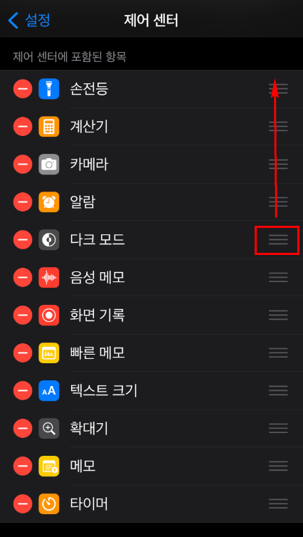 설정 제어센터에서 '다크 모드'를 제일 첫 번째로 이동시켜 볼까요?