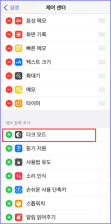 제어 항목 추가에서 '다크 모드'를 눌러 추가를 해줍니다.