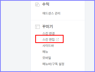 우선 블로그 관리홈으로 들어가서 꾸미기에서 스킨편집을 클릭을 합니다.