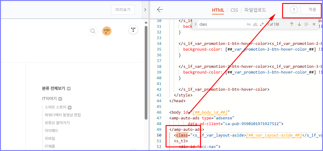찾으면 맨 위에서 46~50번쯤에 class="....... 가 보입니다.