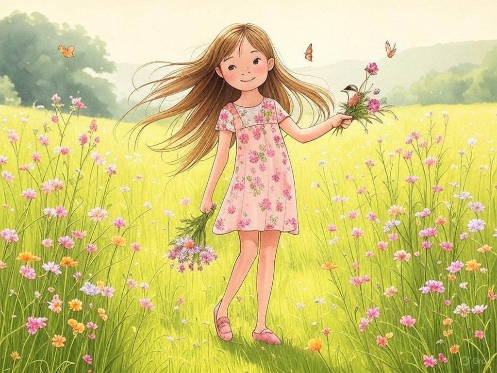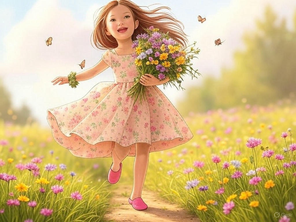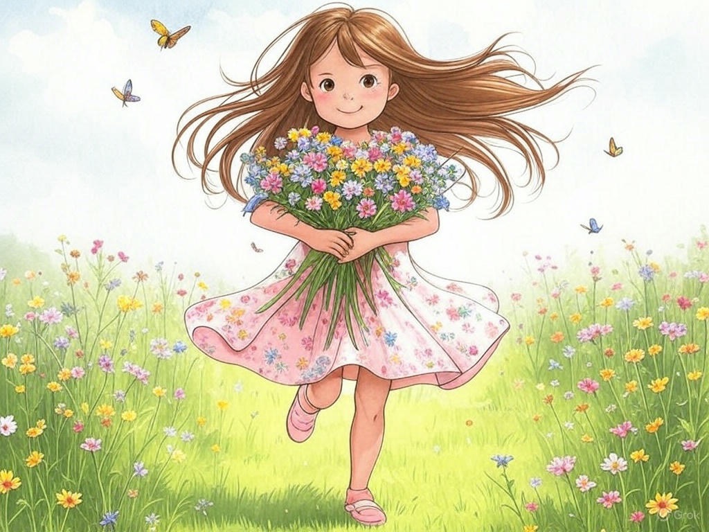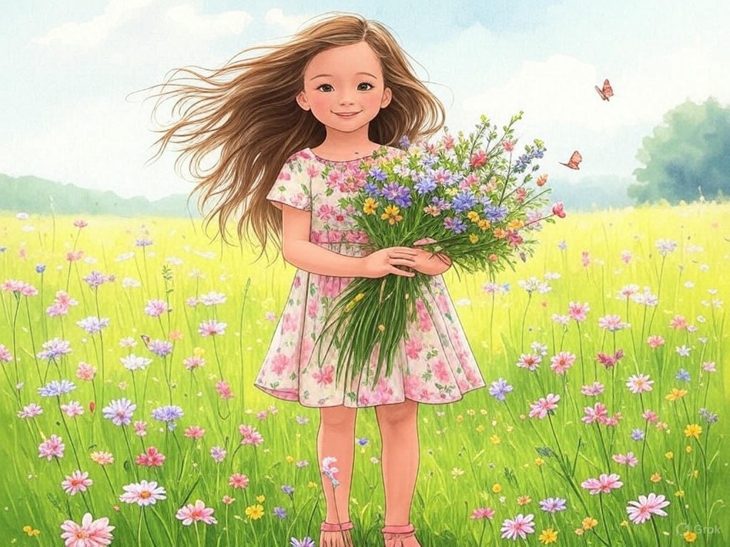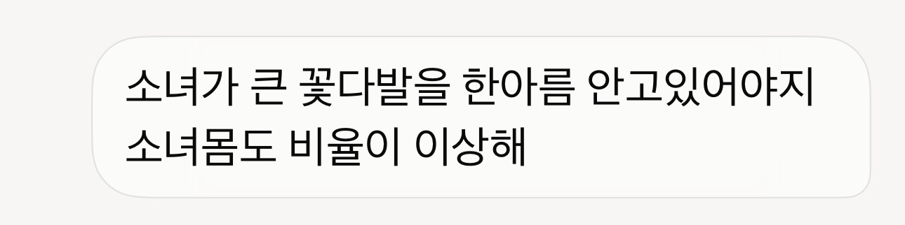 '소녀가 큰 꽃다발을 한 아름 안고 있어야지.. 소녀몸도 비율이 이상해'라고 했더니 또 다른 그림을 바로 그려줍니다.