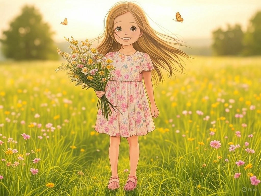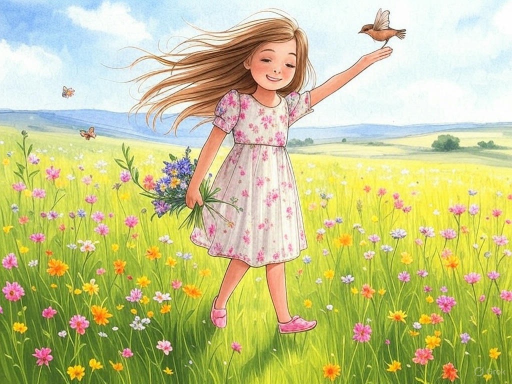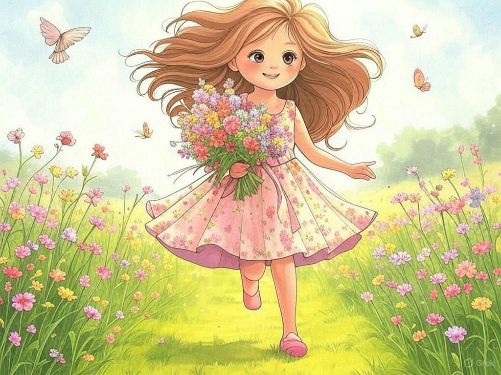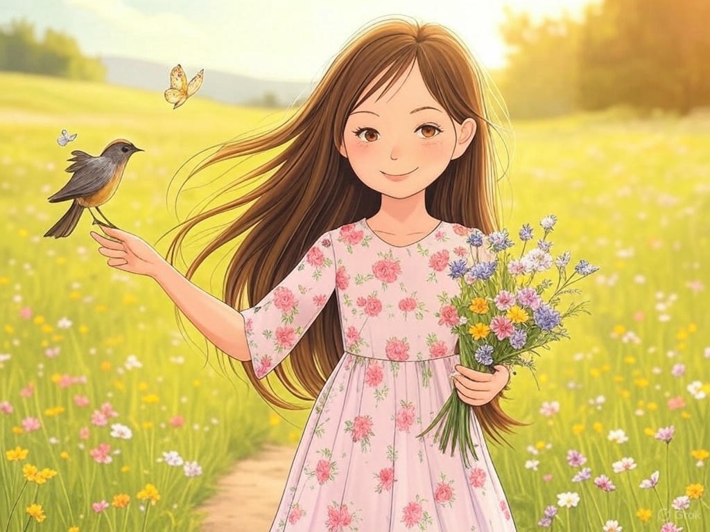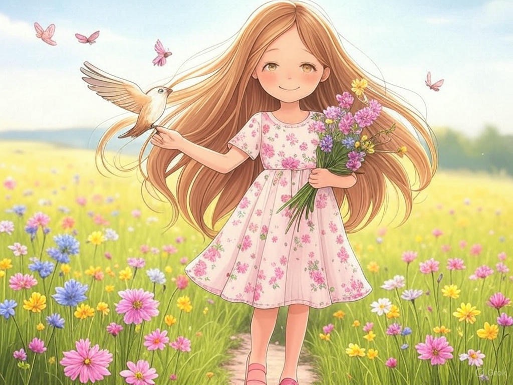 Grok3가 못 알아들은 것 같아 '오른팔로 꽃을 안고 있고 왼손에 새가 앉으려고 하고 있어'라고 다시 한번 얘기했습니다.