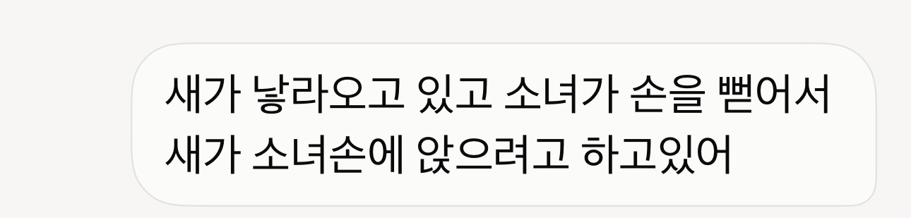 이번에는 새를 등장시키고 싶어서... 새가 낳라??? ㅎㅎ 이렇게 오타를;; '새가 날아오고 소녀가 손을 뻗어서 새가 소녀손에 앉으려고 하고 있어'라고 더 디테일한 요구를 해봤습니다.