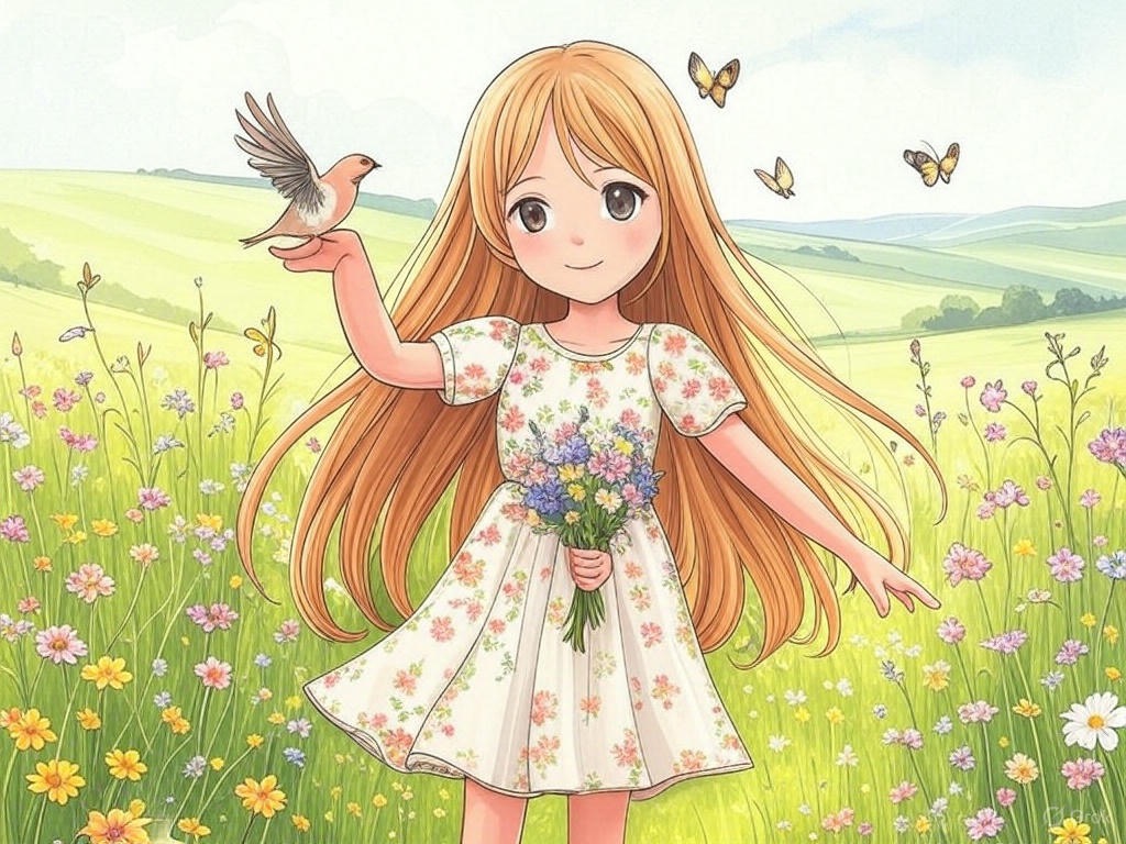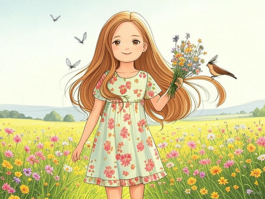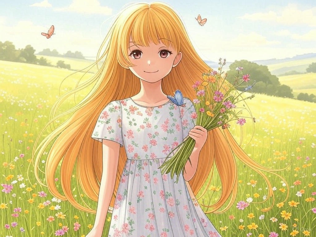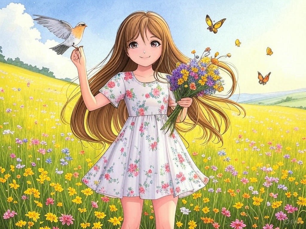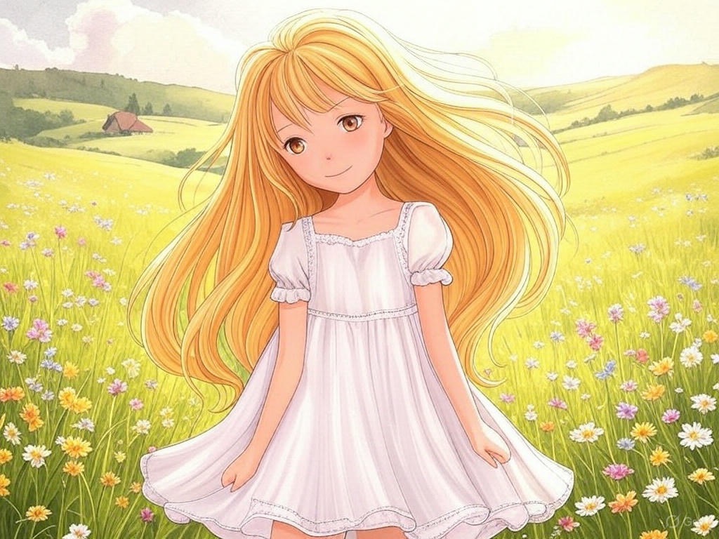 소녀들이 더 이뻐졌으면 해서 이번에는 '머리는 길고 바람에 휘날리고 있어'라고 입력했습니다.