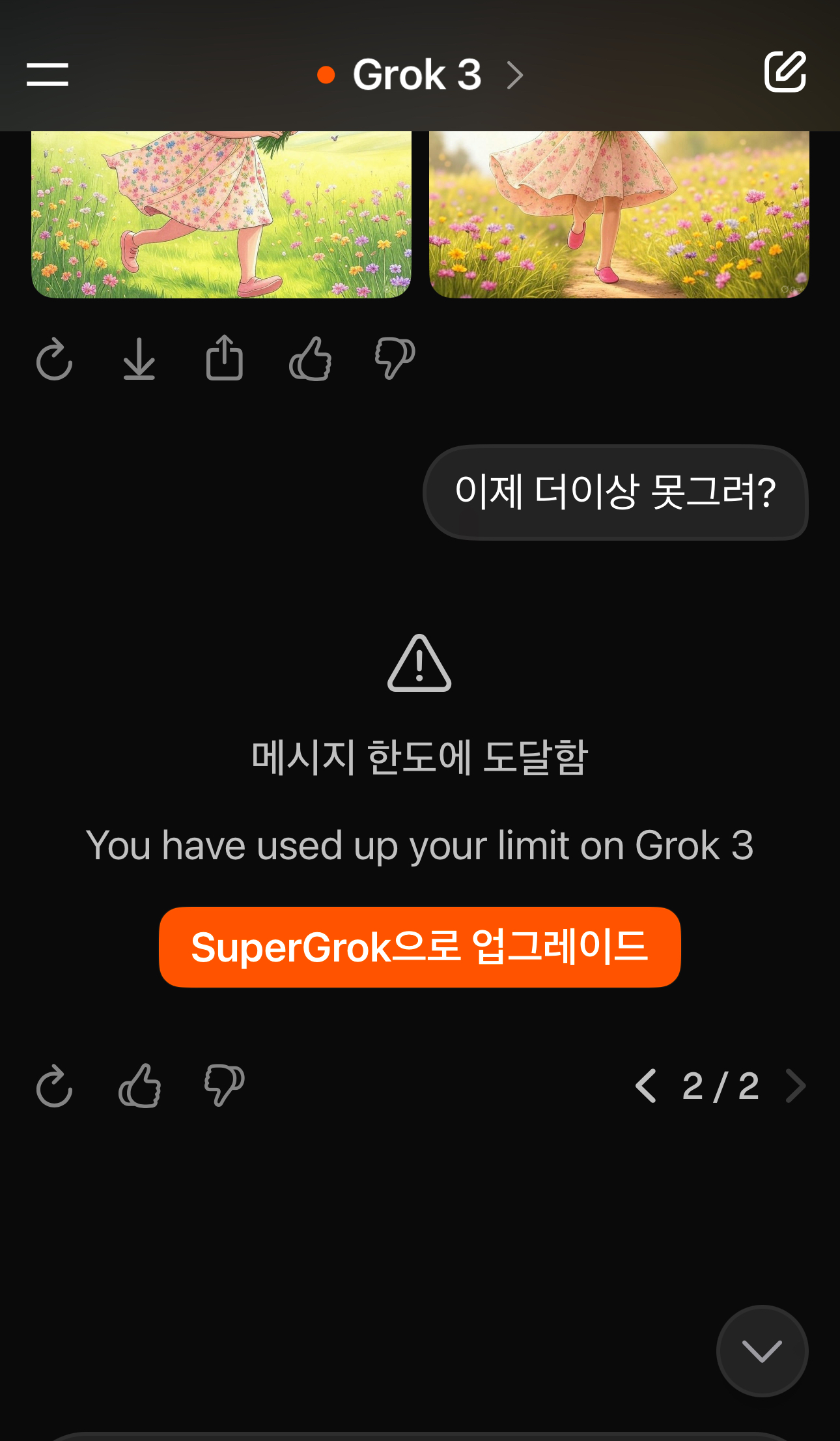 하~~ 메시지 한도에 도달했다고 하네요~ SuperGrok으로 업그레이드하라고.. 하네요